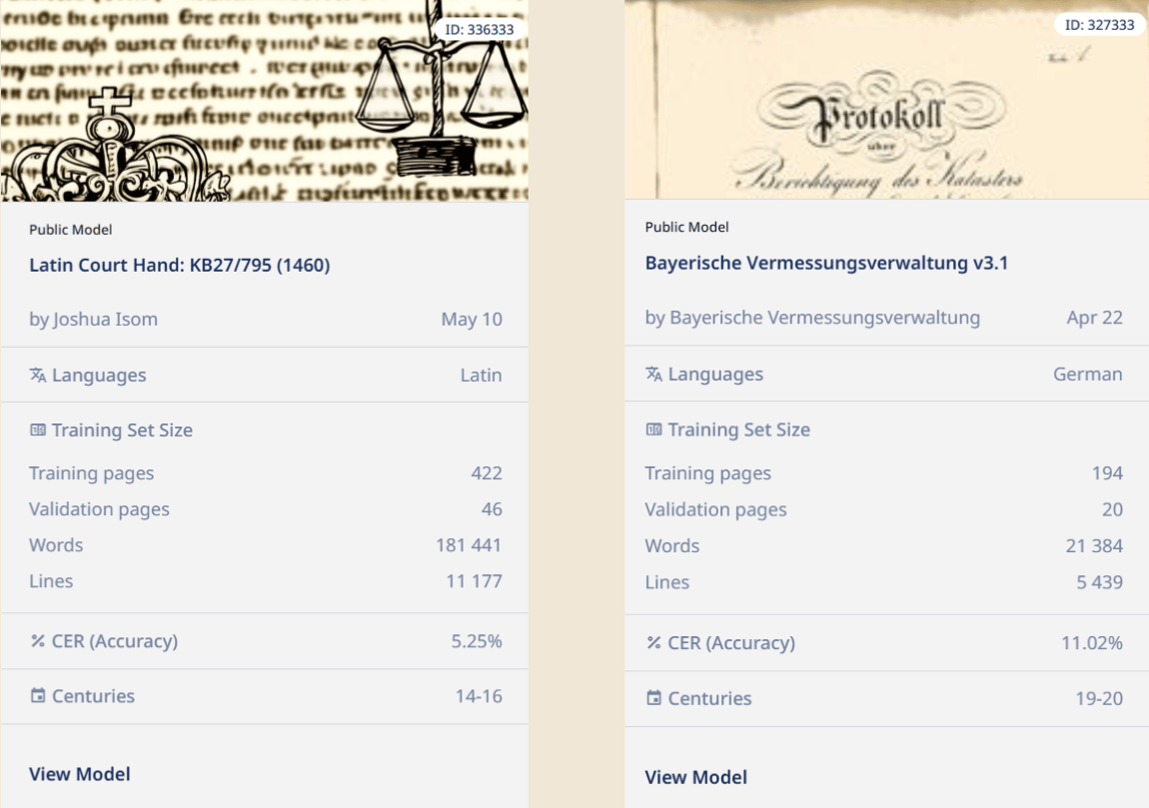 Transkribus offers hundreds of different models, the majority of which were created by the Transkribus community. © Transkribus
